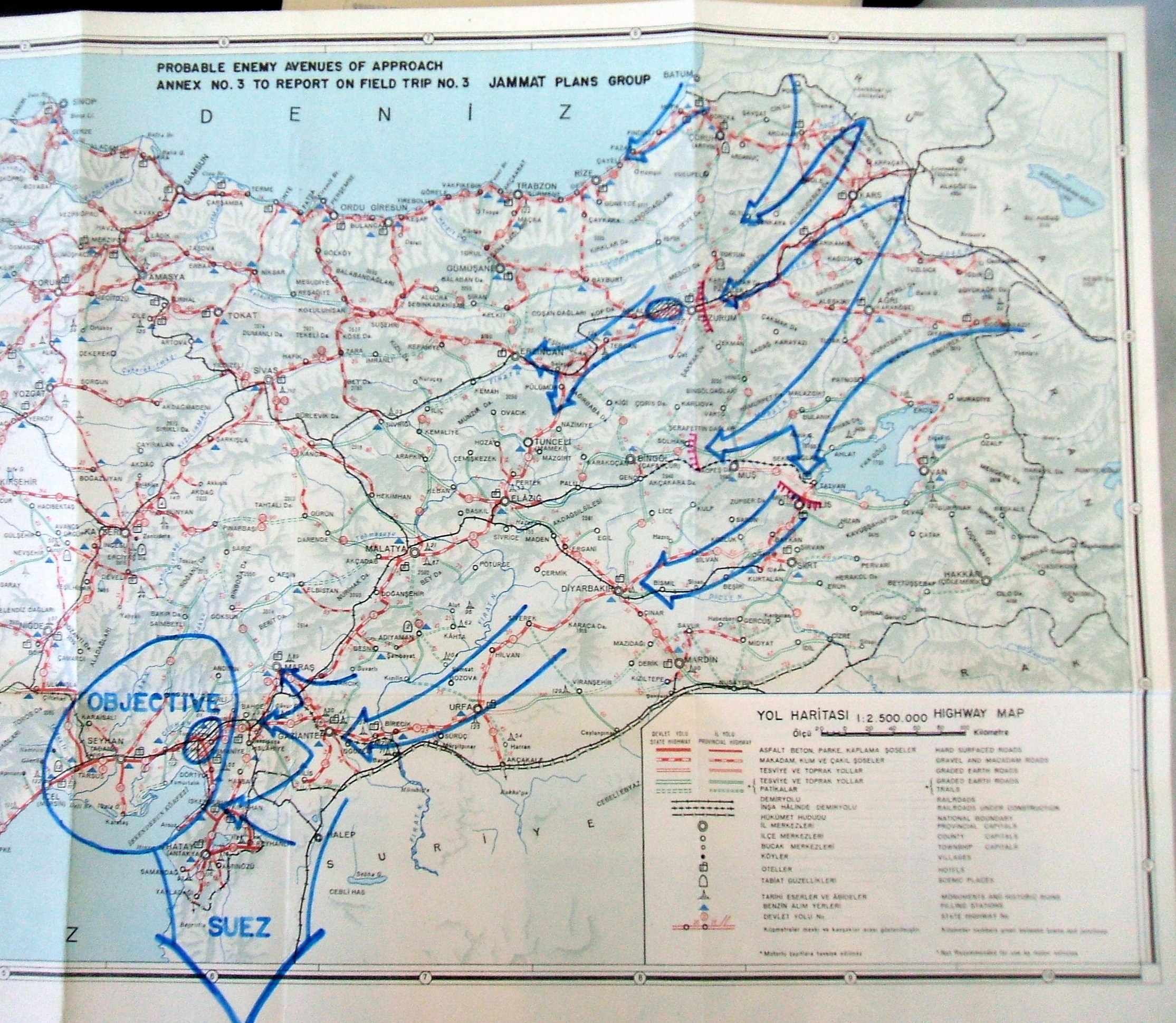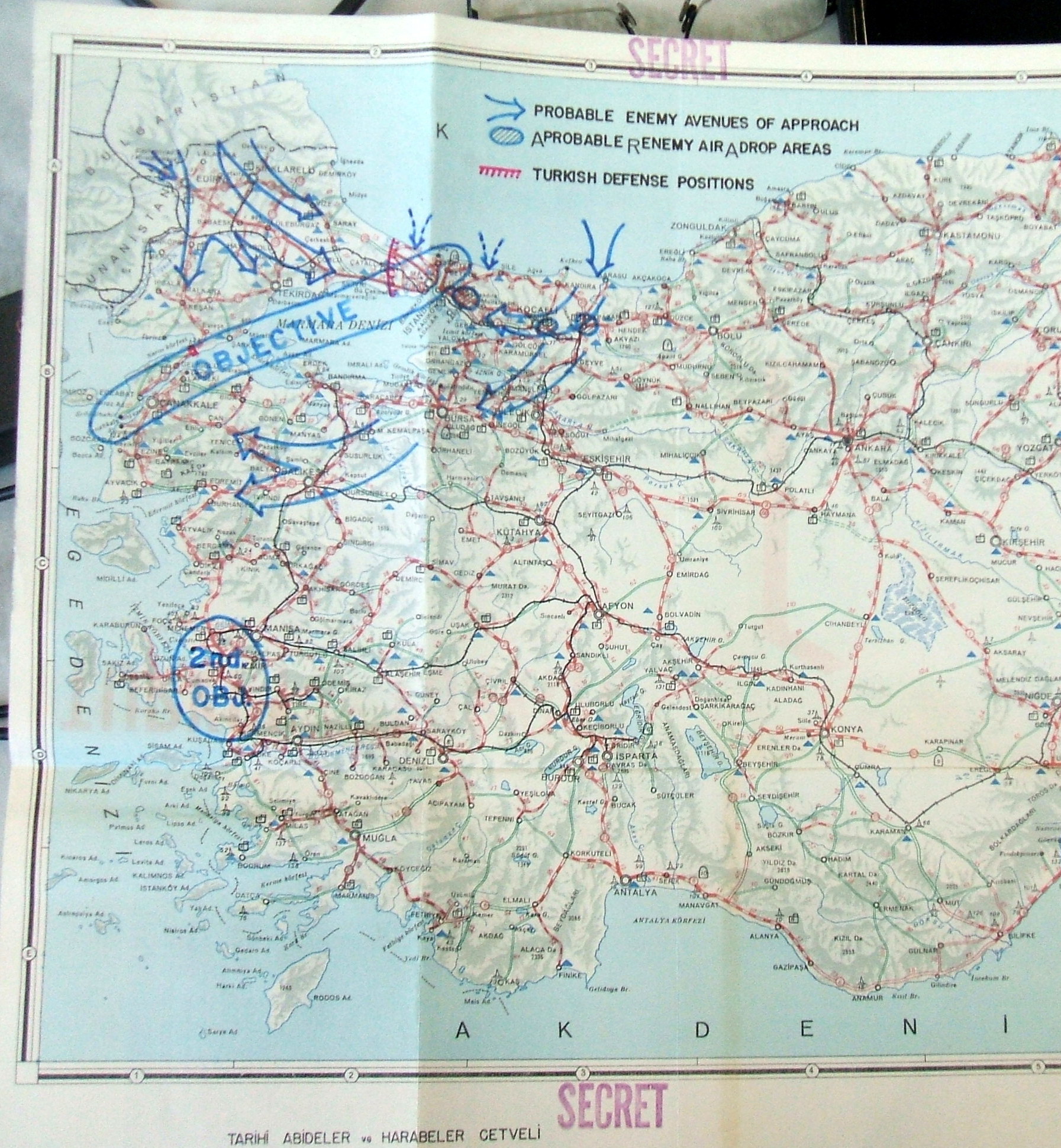 Soğuk Savaş yıllarında hazırlanan bir diğer savunma planında “Tarihi Abideler ve Harabeler Cetveli” ve “Yol Haritası” olduğu anlaşılan harita üzerinde gizli anlamına gelen “secret” damgasının yer aldığı, hedef, olası düşman indirma sahaları, olası düşman yaklaşma alanları, Türk savunma konumları ve savunma hatları notlarının düşüldüğü görülmektedir.