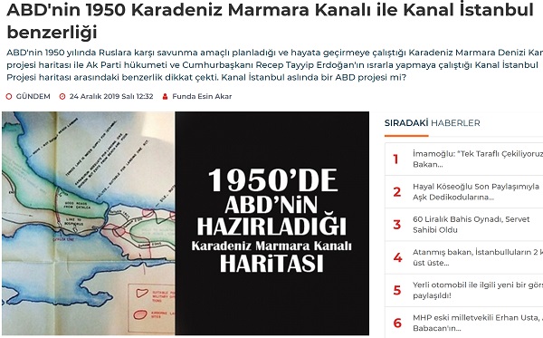 Bu iddiaya destek mahiyetinde “2019 Kanal İstanbul Projesinin haritası ile 1950 tarihinde ABD tarafından hazırlanan Marmara Denizi Kanalı Projesinin haritası arasındaki benzerlik şaşırtıcı!” notuyla sosyal medyada yapılan paylaşımlardan biri şöyle: