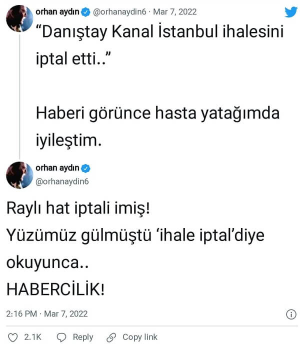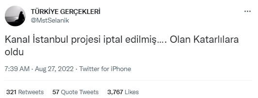 Ezcümle, “Kanal İstanbul güzergâhındaki bir geçiş ihalesinin iptal kararı”, “Kanal İstanbul’un iptalinin kararlaştırıldığı” sanılarak paylaşılmış…