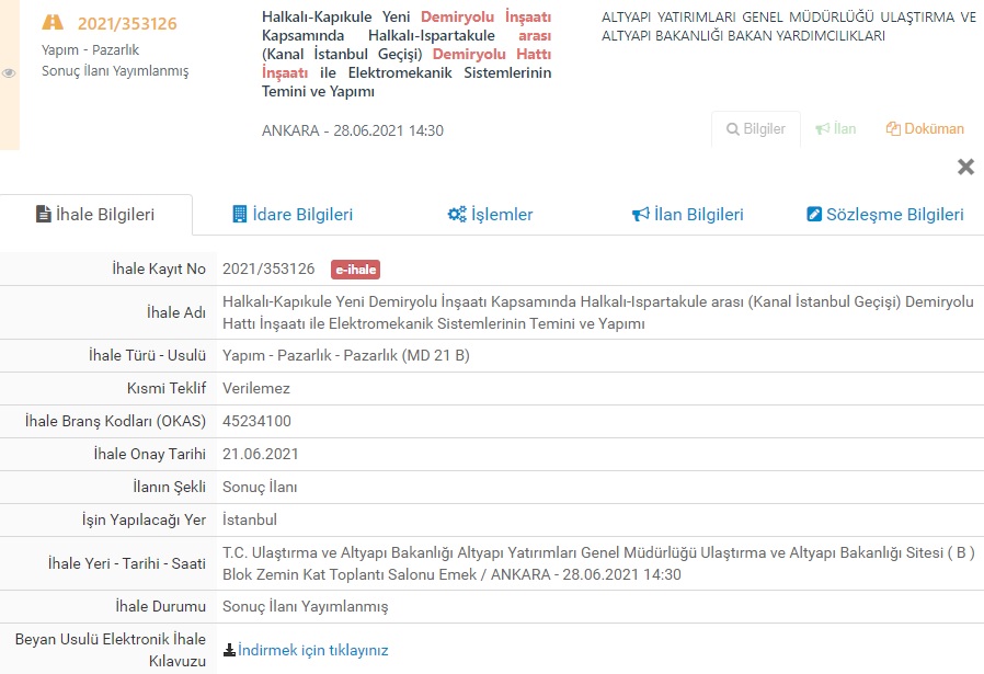 Ulaştırma ve Altyapı Bakanlığı Altyapı Yatırımları Genel Müdürlüğü, 28 Haziran 2021 tarihinde “Halkalı-Kapıkule Yeni Demiryolu İnşaatı Kapsamında Halkalı-Ispartakule Arası (Kanal İstanbul Geçişi) Demiryolu Hattı İnşaatı ile Elektromekanik Sistemlerinin Temini ve Yapımı” ihalesini 4734 sayılı Kamu İhale Kanunu’nun 21/b maddesi kapsamında ilansız olarak pazarlık usulü yöntemi ile gerçekleştirmişti (Söz konusu kararın henüz Danıştay Karar Arama sayfasına yansımadığı görülüyor).