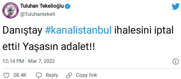 Tuluhan Tekelioğlu: “Danıştay #kanalistanbul ihalesini iptal etti! Yaşasın adalet!!”