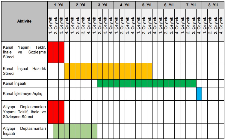 Kanal İstanbul’un ihale aşamasından itibaren finansmanın kesinleştirilmesi, arazi çalışmaları, uygulama projelerinin hazırlanması, mobilizasyon çalışması, kanal inşaatı, altyapı deplasmanları yapımı ve inşaatı gibi faaliyetleri içeren yatırım planı şu şekilde tasarlanmıştı: