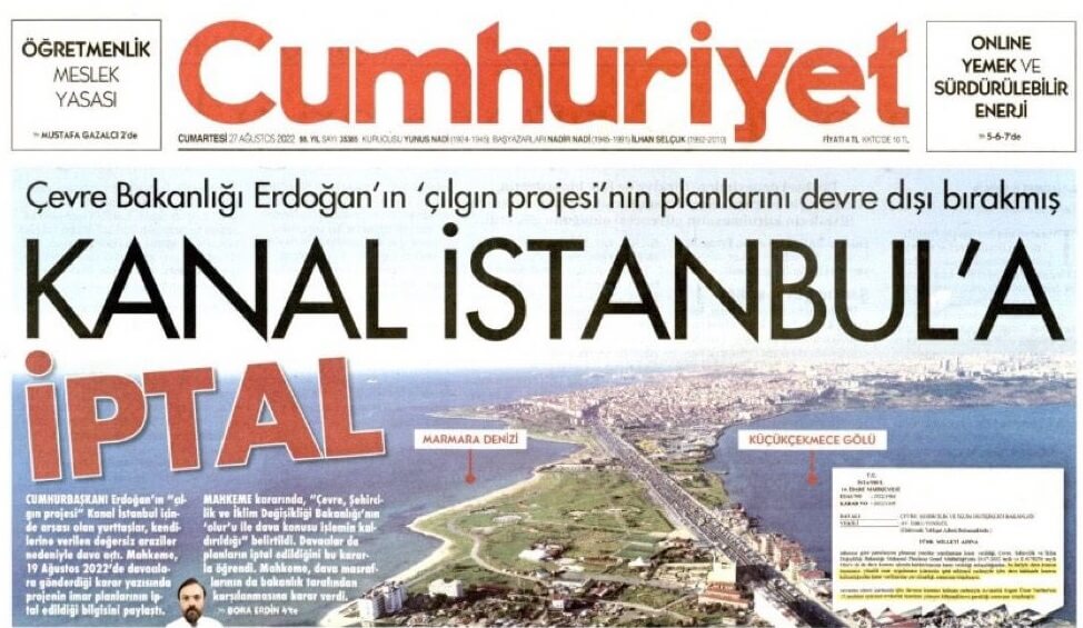 Cumhuriyet gazetesinin “Kanal İstanbul’a iptal” manşeti, “Kanal İstanbul projesi iptal edilmiş” olarak algılanmış (Cumhuriyet, ilgili mahkeme kararına internet sitelerinde yayımlanan 27 Ağustos 2022 tarihli “Bakanlık, Erdoğan’ın çılgın proje dediği ‘Kanal İstanbul’un planlarını devre dışı bırakmış!” başlıklı haberde yer vermişti).