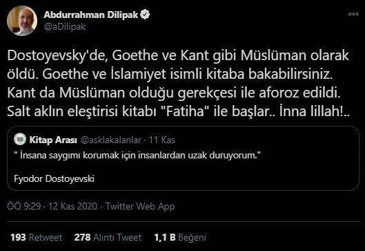 “Dostoyevsky’de, Goethe ve Kant gibi Müslüman olarak öldü. Goethe ve İslamiyet isimli kitaba bakabilirsiniz. Kant da Müslüman olduğu gerekçesi ile aforoz edildi. Salt aklın eleştirisi kitabı “Fatiha” ile başlar.. İnna lillah!..”