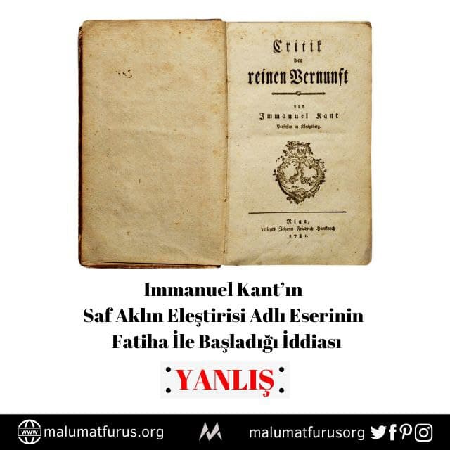 Alman filozof Immanuel Kant’ın (1724-1804) 1781’de basılan “Saf Aklın Eleştirisi” (“Saf Aklın Kritiği” ya da “Arı Usun Eleştirisi”) (“Kritik der reinen Vernunft“) adlı kitabının Kant’ın el yazısı ile yazdığı Fatiha ile başladığı iddiasının doğruluk payı bulunmamaktadır.