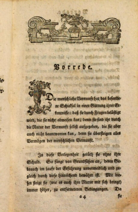 Kant’ın Saf Aklın Eleştirisi kitabının 1781 yılında yayımlanan birinci baskısının önsözü şöyle başlar (Taşkıner Ketenci (2016). “Saf Aklın Eleştirisi’nde Önsözler ve İşlevleri“. Beytulhikme An International Journal of Philosophy. Volume 6 Issue 1 June 2016):