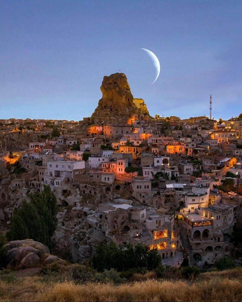 Uçhisar Kalesi manzarasına hilâl evresinden Yeni Ay aşamasına geçmekte olan Ay şöyle montajlanmıştı: