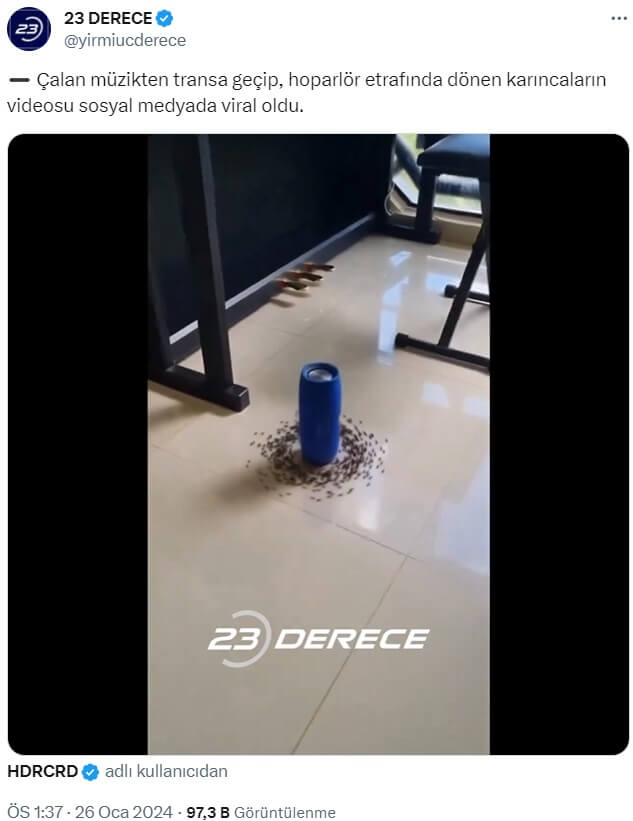 23 Derece (@yirmiucderece): “➖ Çalan müzikten transa geçip, hoparlör etrafında dönen karıncaların videosu sosyal medyada viral oldu.”