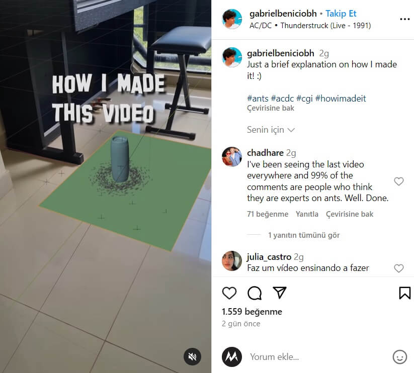 “VFX uzmanı” olarak kendini tanıtan Gabriel Benício “gabrielbeniciobh” uzantılı Instagram hesabında bahsi geçen videoyu “AC/DC’ye tepki veren karıncalar” (“Ants reacting to AC/DC”) notuyla 23 Ocak 2024 günü paylaşmış.