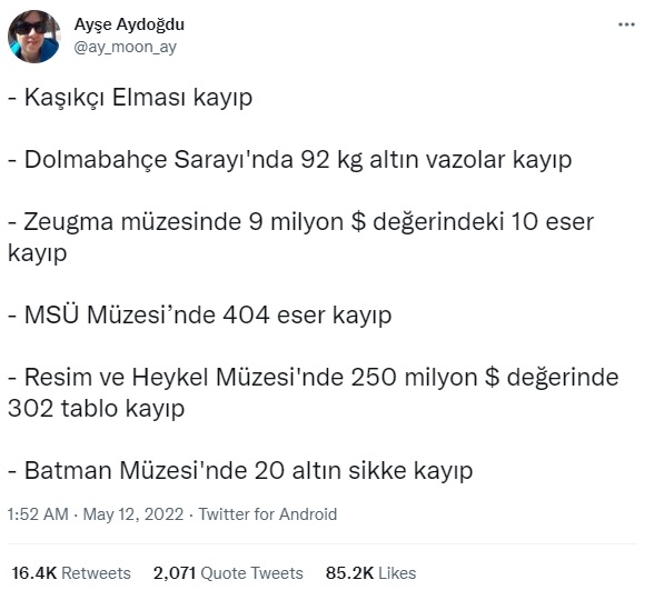 Geçtiğimiz günlerde Barbaros Şansal’ın “laga luga yapma , Kaşıkçı elması nerede hesap ver !” tweetinin ve ve Ayşe Aydoğdu adlı Twitter profilinin Kaşıkçı Elması’nın yanı sıra birçok eserin ve değerli eşyanın da kayıp olduğu iddiasını içeren paylaşımıyla bu konu tekrar gündeme geldi.