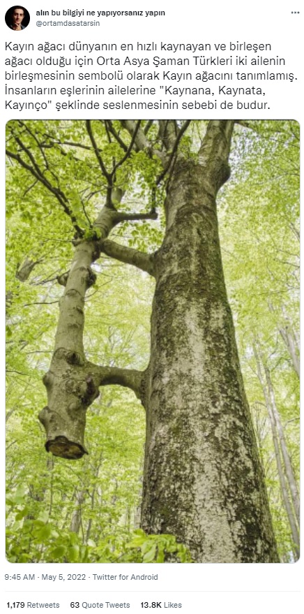 “Kayın ağacı dünyanın en hızlı kaynayan ve birleşen ağacı olduğu için Orta Asya Şaman Türkleri iki ailenin birleşmesinin sembolü olarak Kayın ağacını tanımlamış. İnsanların eşlerinin ailelerine “Kaynana, Kaynata, Kayınço” şeklinde seslenmesinin sebebi de budur.”
