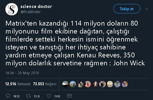 “Matrix’ten kazandığı 114 milyon doların 80 milyonunu film ekibine dağıtan, çalıştığı filmlerde setteki herkesin ismini öğrenmek isteyen ve tanıştığı her ihtiyaç sahibine yardım etmeye çalışan Kenau Reeves, 350 milyon dolarlık servetine rağmen : John Wick”