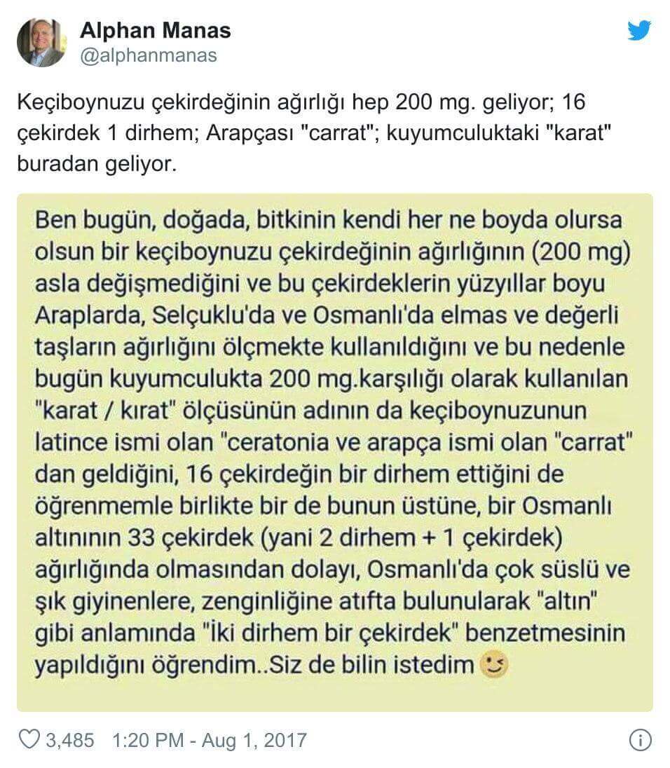 “Ben bugün; doğada, bitkinin kendi her ne boyda olursa olsun bir keçiboynuzu çekirdeğinin ağırlığının (200 mg) asla değişmediğini ve bu çekirdeklerin yüzyıllar boyu Araçlarda, Selçuklu’da ve Osmanlı’da elmas ve değerli taşların ağırlığını ölçmekte kullanıldığını ve bu nedenle bugün kuyumculukta 200 mg. karşılığı olarak kullanılan “karat / kırat” ölçüsünün adının da keçiboynuzunun latince ismi olan “ceratonia ve araçça ismi olan “karrat” dan geldiğini, 16 çekirdeğin bir dirhem ettiğini de öğrenmemle birlikte bir de bunun üstüne, bir Osmanlı altınının 33 çekirdek (yani 2 dirhem + 1 çekirdek) ağırlığında olmasından dolayı, Osmanlı’da çok süslü ve şık giyinenlere, zenginliğine atıfta bulunularak “altın” gibi anlamında “İki dirhem bir çekirdek” benzetmesinin yapıldığını öğrendim.. Siz de bilin istedim.”