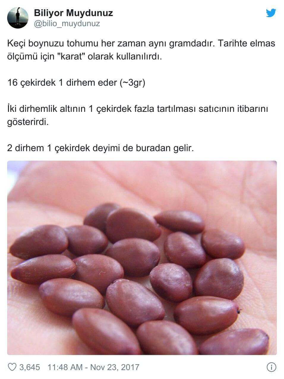 “Keçiboynuzu çekirdeğinin ağırlığı hep 200 mg. geliyor; 16 çekirdek 1 dirhem; Arapçası “carrat”; kuyumculuktaki “karat” buradan geliyor.”
