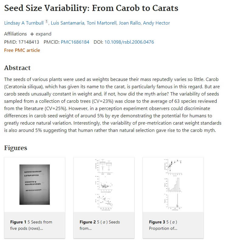 Keçiboynuzu tohumun kütlesinin sabit olmadığını ortaya koyan makalede, Mallorca civarında çok sayıda ağaçtan toplanan keçiboynuzu tohumları tartılarak, ağırlıklarındaki değişkenlik diğer 63 baklagil türüyle karşılaştırarak test edilmiş. Ardından insanların tohum ağırlığındaki farklılıkları gözle algılama yeteneği analiz edilmiş. Bunun için keçiboynuzu tohumu boyutlarının dağılımı 1907 yılından önce dünyadaki karat ağırlık standartlarının dağılımıyla karşılaştırarak test edilmiş.