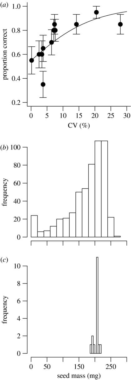 Keçiboynuzu tohumlarının ağırlık olarak sabit olduğu efsanesini çürüten makale bu tespit ile yetinmeyip insanların farklı ağırlığa sahip keçiboynuzu çekirdekleri tespit edip edemediğine de eğilinmiş. Bir çift tohumun daha ağır olduğunu doğru bir şekilde tanımlayan gözlemcilerin oranına ilişkin regresyon formülü “χ 2 1 = 19.7 (p <0.0001) olarak tespit edilen makalede varyasyon katsayısı % 10 iken insanların % 70’inden fazlasınnın daha ağır tohumu doğru bir şekilde tanımlayabildiği ortaya koyulmuş. Çalışmanın sonuçları, insanların tohumları gözle seçmede oldukça iyi olduğunu ve ağırlık farklarını yaklaşık % 5 oranında ayırt edebileceğini gösteriyor.