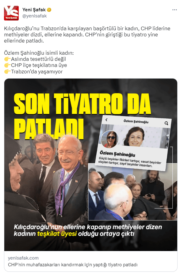 Medya Muhtarı: “Yine CHP yine başörtü şovu! Dün Trabzon’da Kılıçdaroğlu’na methiyeler düzen Özlem Şahinoğlu’nun aslında kapalı olmadığı, Ajansın partili elemanı olduğu ve tiyatro oynadığı ortaya çıktı. Şahinoğlu tepkiler üzerine sosyal medya hesaplarını kilitledi..”