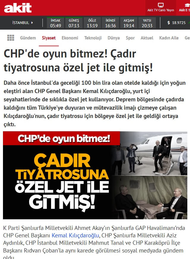 Yeni Akit: “CHP’de oyun bitmez! Çadır tiyatrosuna özel jet ile gitmiş!”