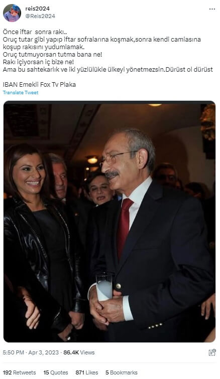 reis2024: “Önce iftar sonra rakı.. Oruç tutar gibi yapıp iftar sofralarına koşmak, sonra kendi camiasına koşup rakısını yudumlamak. Oruç tutmuyorsan tutma bana ne! Rakı içiyorsan iç bize ne! Ama bu sahtekarlık ve iki yüzlülükle ülkeyi yönetmezsin. Dürüst ol dürüst”