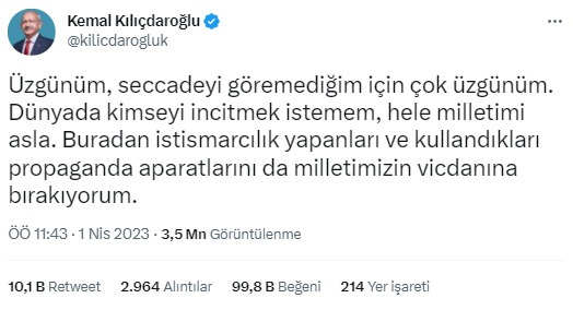 Kemal Kılıçdaroğlu, 1 Nisan 2023 günü Twitter hesabından yaptığı paylaşımda seccadeye farkında olmayarak bastığını ve bunun için üzgün olduğunu duyurdu: