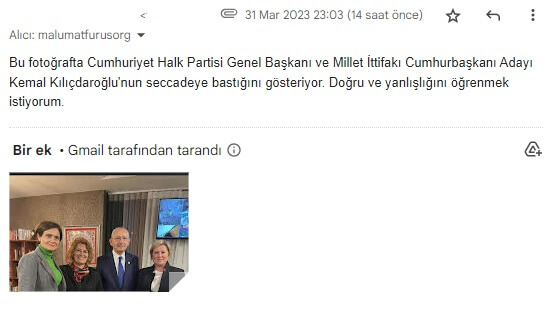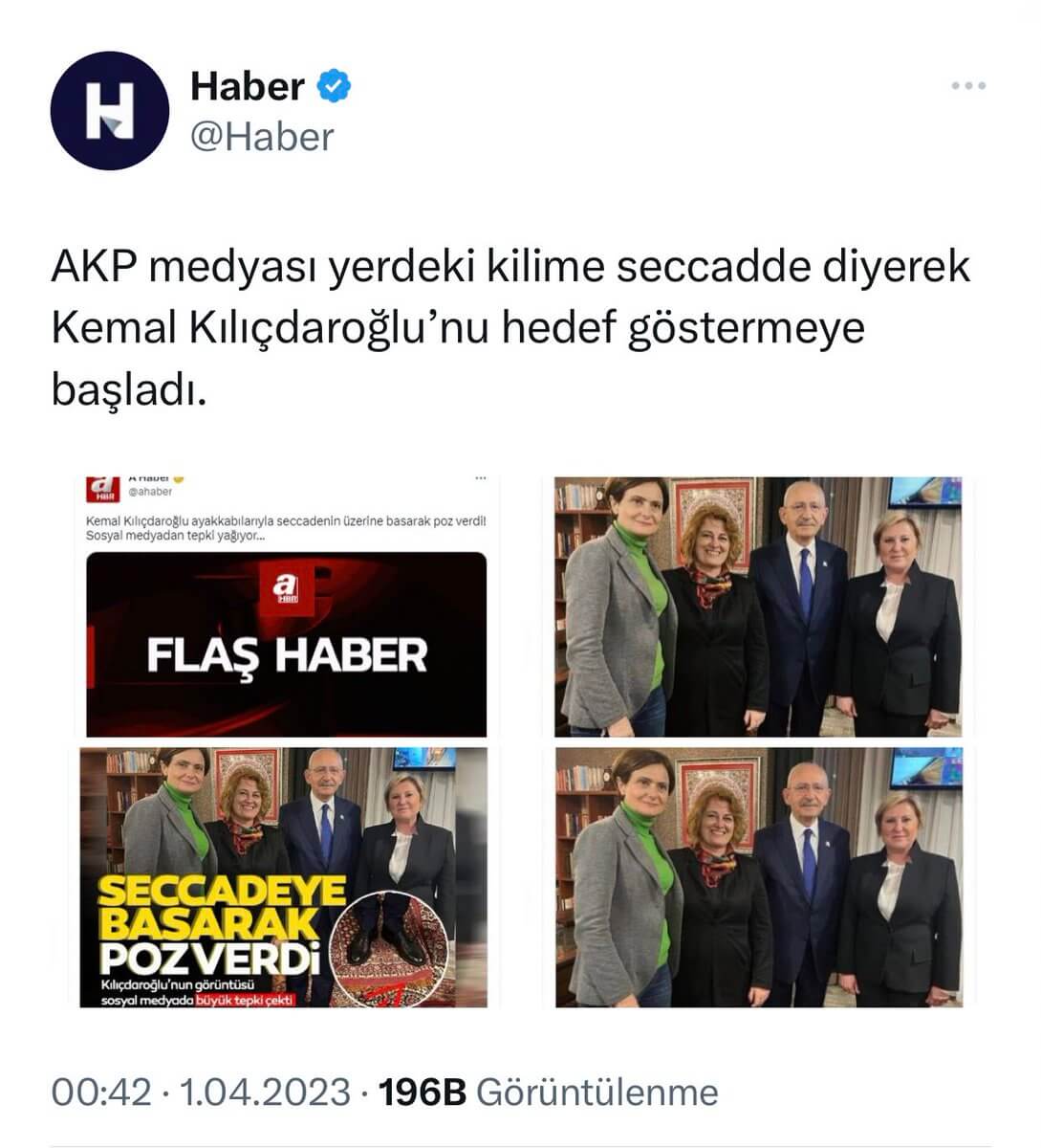 Cumhuriyet Halk Partisi (CHP) Genel Başkanı ve Millet İttifakı Cumhurbaşkanı Adayı Kemal Kılıçdaroğlu’nun seccade üzerinde ayakkabısıyla görüntülendiği fotoğraf 30 Mart 2023 günü sosyal medya platformlarının ana gündem maddelerinden biri oldu.
