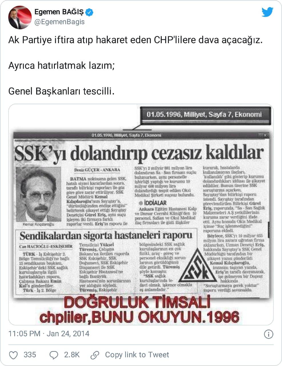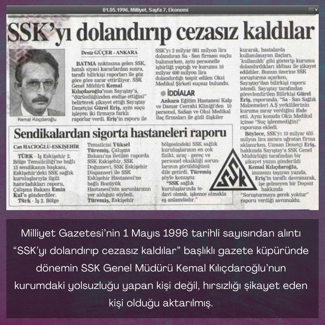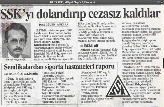 Milliyet Gazetesi’nin 1 Mayıs 1996 tarihli sayısından alıntı “SSK’yı dolandırıp cezasız kaldılar” başlıklı gazete küpüründe dönemin SSK Genel Müdürü Kemal Kılıçdaroğlu’nun kurumdaki yolsuzluğu yapan kişi değil, hırsızlığı şikayet eden kişi olduğu aktarılmış.