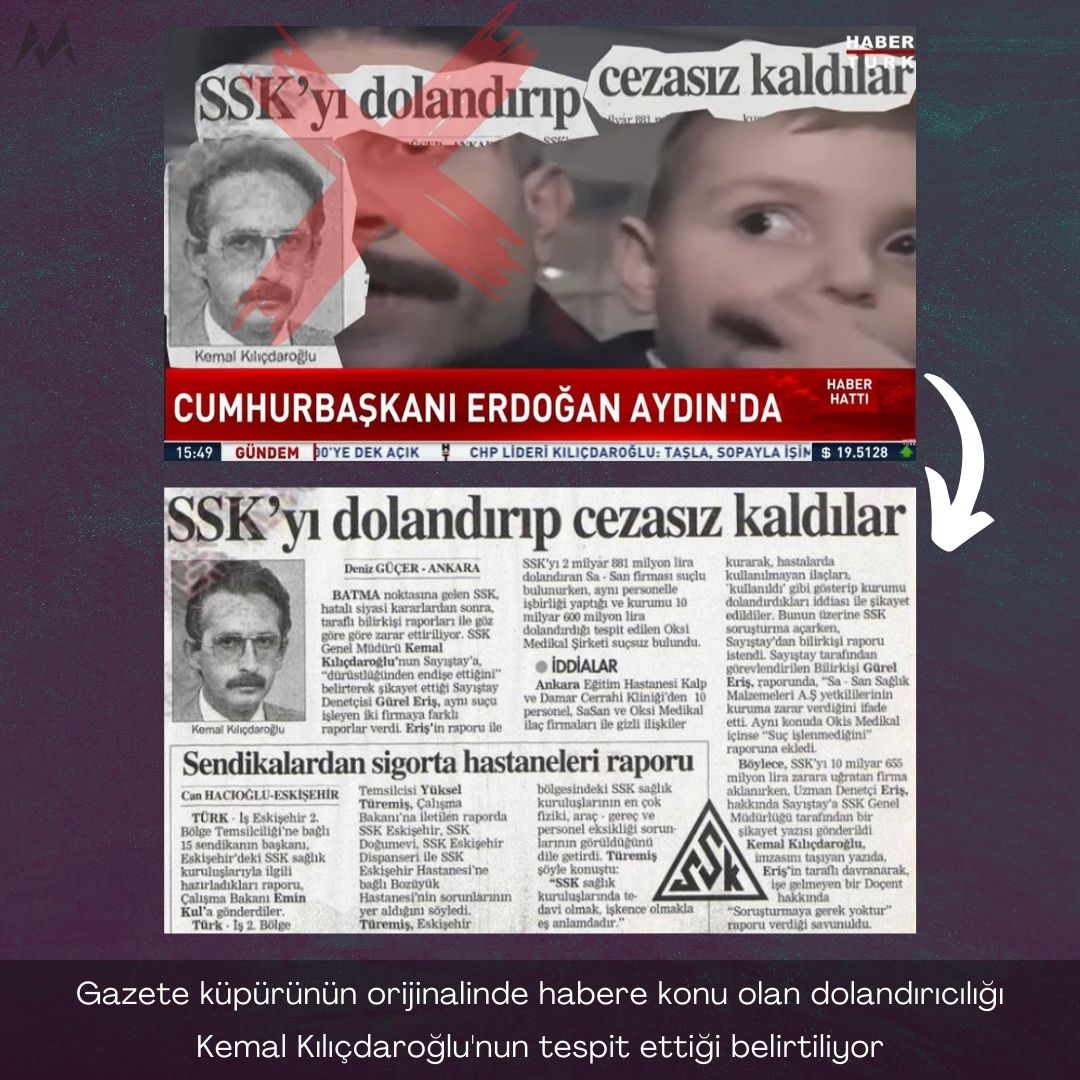 İLAVE: Cumhurbaşkanı Erdoğan, Aydın mitinginde Kılıçdaroğlu’nun fotoğrafının üzerinde “SSK’yı dolandırıp cezasız kaldılar” yazan gazete küpürü gösterdi. Ancak, yukarıda aktarıldığı üzere gazete küpürünün orijinalinde, habere konu olan dolandırıcılığı Kemal Kılıçdaroğlu’nun tespit ettiği belirtiliyor.