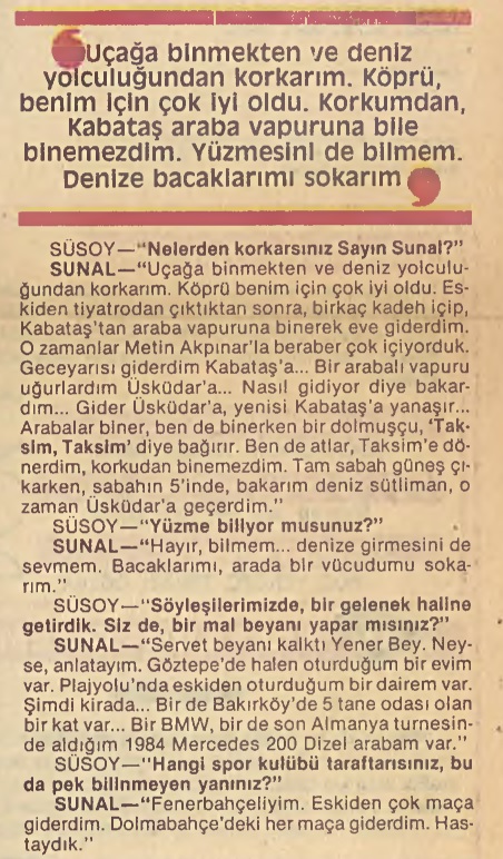 Bir başka demecinde Sunal, şu ifadeleri kullanmıştı (Renk. Milliyet’in İkinci Gazetesi. 8 Mayıs 1985. Sf: 1):