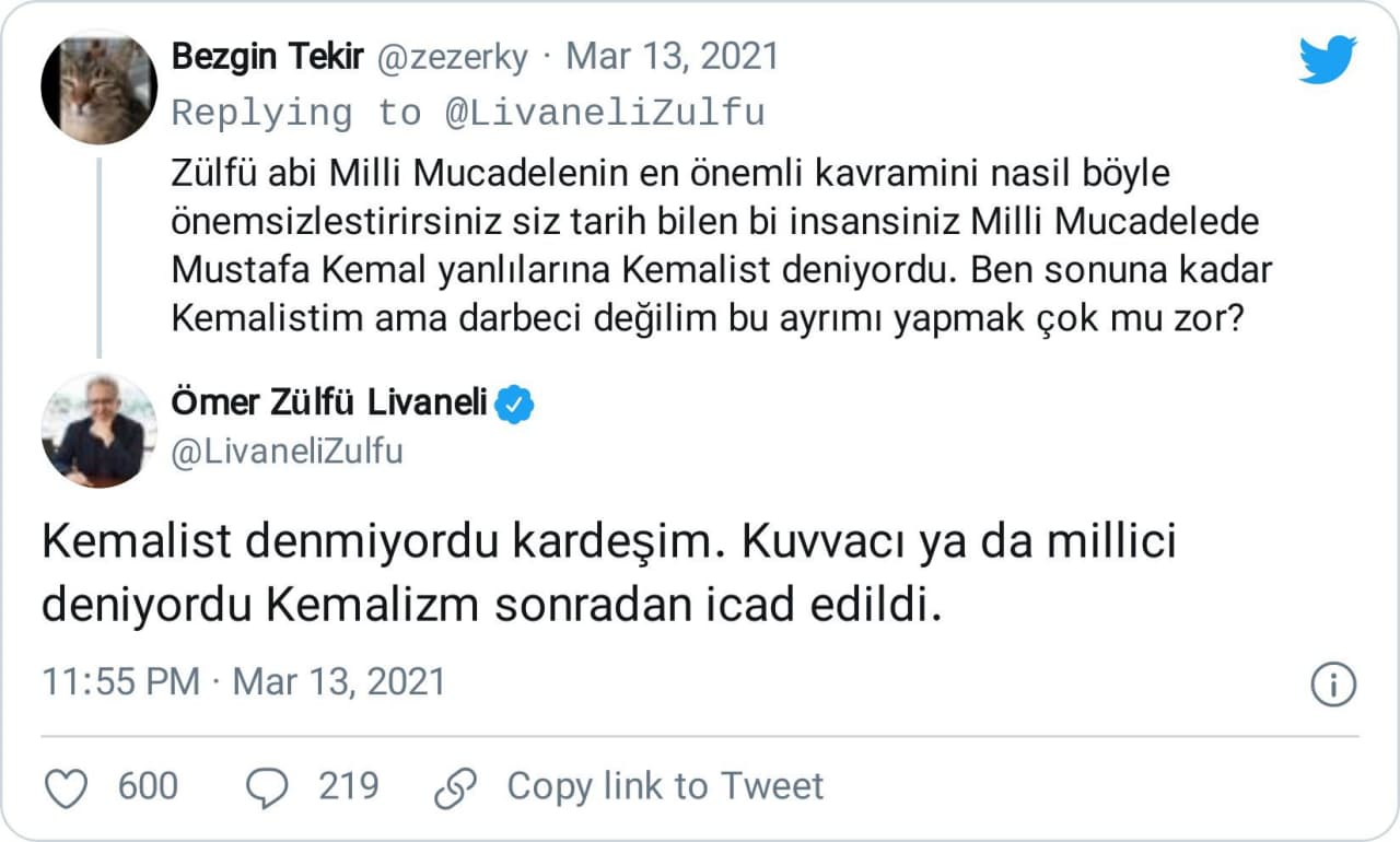 “Yabancıların Kemalist dediği doğru tabi. Atatürk bu kelimeyi hayatında bir kez bile kullanmamıştır ana mesele bu değil. Yüzlerine Kemalist, Atatürkçü maskesi takan bazılarının, O’nun mirasına verdikleri zarar. Bu kadar mı zor anlamak.”