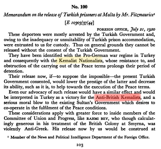 21 Temmuz 1920’de Mr. Fitzmaurice, Türk esirleri hakkında düştüğü bir notta şöyle dedi: “Buradaki esirlerin hepsi Kemalist milliyetçilerin yanındadır. Eğer bunları serbest bırakırsak İngiltere’nin düşmanı Kemalistlerin bir zaferi sayılacaktır.” (Erol Ulubelen, İngiliz Gizli Belgelerinde Türkiye, 3. bas, İstanbul, 2009, s. 253)