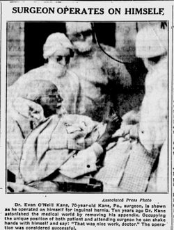 ABD’li cerrah Evan O’Neill Kane (1861 – 1932), cerrahi operasyonlar için lokal anestezinin işe yarayabileceğini kanıtlamak amacıyla kendi apandisit ameliyatını (apendektomi) 15 Şubat 1921 tarihinde yapmıştı (Cerrah olan küçük kardeşi Thomas, Kane apandisini çıkarır çıkarmaz operasyonu devralmıştı). Kane 1932 yılında yine lokal anestezi kullanarak kasık fıtığı ameliyatını gerçekleştirmişti. İlk ameliyatında sadece hemşirelerin bulunduğu ameliyat odasında bu defa basın mensupları da yer almıştı.