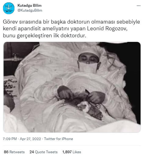 Leonid Rogozov’un başka bir doktor yokluğunda kendi apandisit ameliyatını yapan ilk doktor olduğu iddiasını içeren paylaşım örneği şöyle sunulabilir: