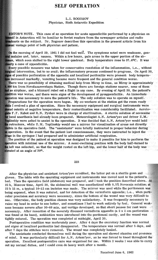 Rus doktor Leonid İvanoviç Rogozov (1934 – 2000), 1961 yılında Antarktika‘daki bir Rus araştırma birimi olan Novolazarevskaya İstasyonu’nda görev yaparken apandisitten ötürü şiddetli ağrı, mide bulantısı, ateş teşhisinin ardından beraberindeki 12 kişilik ekipte bir doktorun bulunmaması nedeniyle kendi apandisini alma kararı almıştı. Lokal anestezi altında 2 saatlik operasyonda kendi apandisini alan Leonid Rogozov ameliyattan sonra kendini dikmişti.