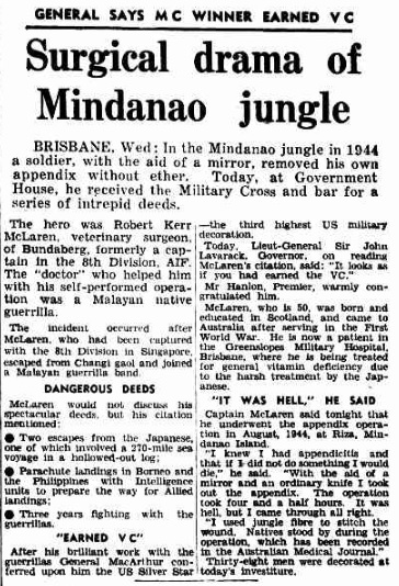 Avustralya Ordusunda subay olarak görev yapan Robert Kerr “Jock” McLaren, veteriner hekimliği konusunda bilgi sahibi olsa da herhangi bir cerrahi uzmanlığı olmamasına rağmen 1944 yılında herhangi bir anestezi olmadan, sadece bir çakı ve bir ayna kullanarak kendi kendine apendektomi yapmıştı.
