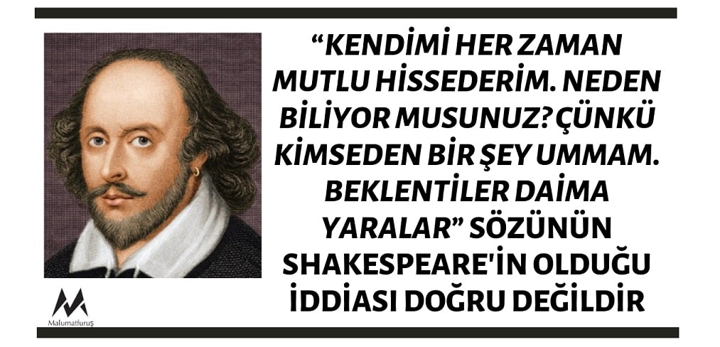 Zamana yenilmeyen yazar olarak bilinen dünya çapında yaygın bir bilinirliğe sahip, Romeo ve Juliet, Macbeth, Hamlet, Othello, Kral Lear gibi İngiliz edebiyatının unutulmaz eserlerinin yazarı William Shakespeare’in (Şekspir) “Kendimi Her Zaman Mutlu Hissederim. Neden Biliyor Musunuz? Çünkü Kimseden Bir Şey Ummam. Beklentiler Daima Yaralar” dediği iddiasının doğruluk payı bulunmuyor. Bu söz Shakespeare’in herhangi bir eserinde yer almamaktadır.