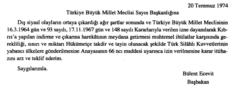 TBMM’de okunan hükûmetin harekât yetkisi isteyen tezkeresi şöyleydi (TBMM Tutanak Dergisi (Gizli Oturum) Toplantı: 13 Cilt: 13/1. 3 üncü Birleşim 1 inci ye 4 üncü Oturum 20.7.1974 Cumartesi):