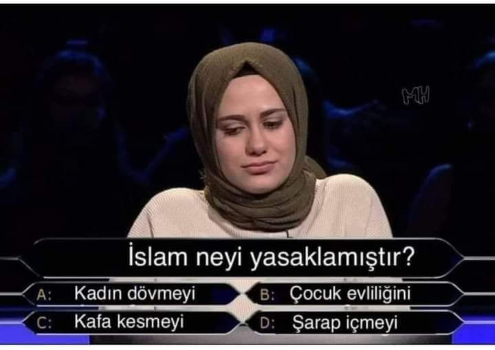Bahsi geçen ekran görüntüsü, “İslam neyi yasaklaşmıştır?” sorusu ve “A: Kadın dövmeyi B: Çocuk evliliğini C: Kafa kesmeyi D: Şarap içmeyi” şıkları eklenerek de paylaşılmış.