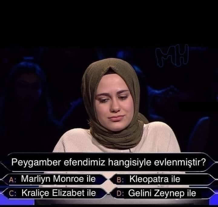 2024 yılı Haziran ayında Kim Milyoner Olmak İster’de “Peygamber efendimiz hangisiyle evlenmiştir?” sorusunun “A: Marilyn Monroe, B: Kleopatra, C: Kraliçe Elizabeth ve D: Gelini Zeynep” şıkları ile sunulduğu, başörtülü bir yarışmacının sorunun doğru yanıtını söylemeye cesaret edemediği iddiası aşağıdaki montaj ekran görüntüsü ile dolaşıma girdi.
