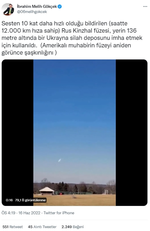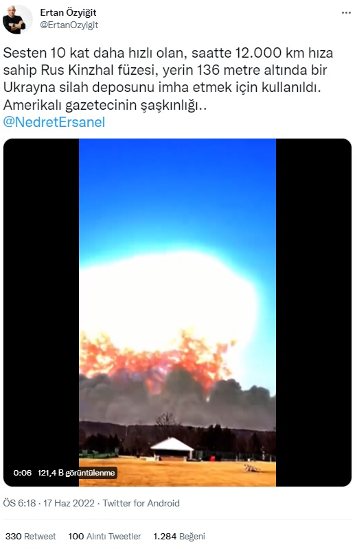 “Sesten 10 kat daha hızlı olan, saatte 12.000 km hıza sahip Rus Kinzhal füzesi, yerin 136 metre altında bir Ukrayna silah deposunu imha etmek için kullanıldı. Amerikalı gazetecinin şaşkınlığı.. @NedretErsanel”