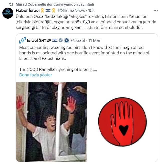“Ünlülerin Oscar’larda taktığı “ateşkes” rozetleri, Filistinlilerin Yahudileri, elleriyle öldürdüğü, organlarını söktüğü ve ellerindeki Yahudi kanını gururla sergilediği bir terör olayından çıkan Filistin terörizminin sembolüdür.”