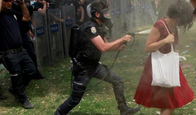 28 Mayıs 2013 günü İstanbul Teknik Üniversitesi Taşkışla Kampüsü civarında meydana gelen gösteri esnasında polisin doğrudan yüzüne biber gazı sıktığı kırmızı elbiseli, bez çantalı genç kadın, ilgili dönemde İTÜ Mimarlık Fakültesi’nde araştırma görevlisi olarak görev yapan Ceyda Sungur‘du.