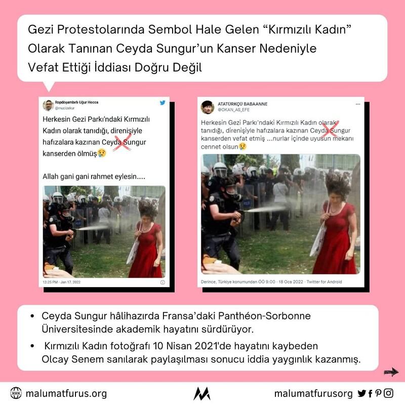 Gezi Parkı’nın simge isimlerinden ve “kırmızılı kadın” olarak tanınan Ceyda Sungur’un vefat ettiği iddiası asılsız. Hâlihazırda Fransa’daki Panthéon-Sorbonne Üniversitesinde (Université Paris 1 Panthéon-Sorbonne) akademik hayatını sürdüren Ceyda Sungur, kanser nedeniyle yaşamını yitirmiş değil.