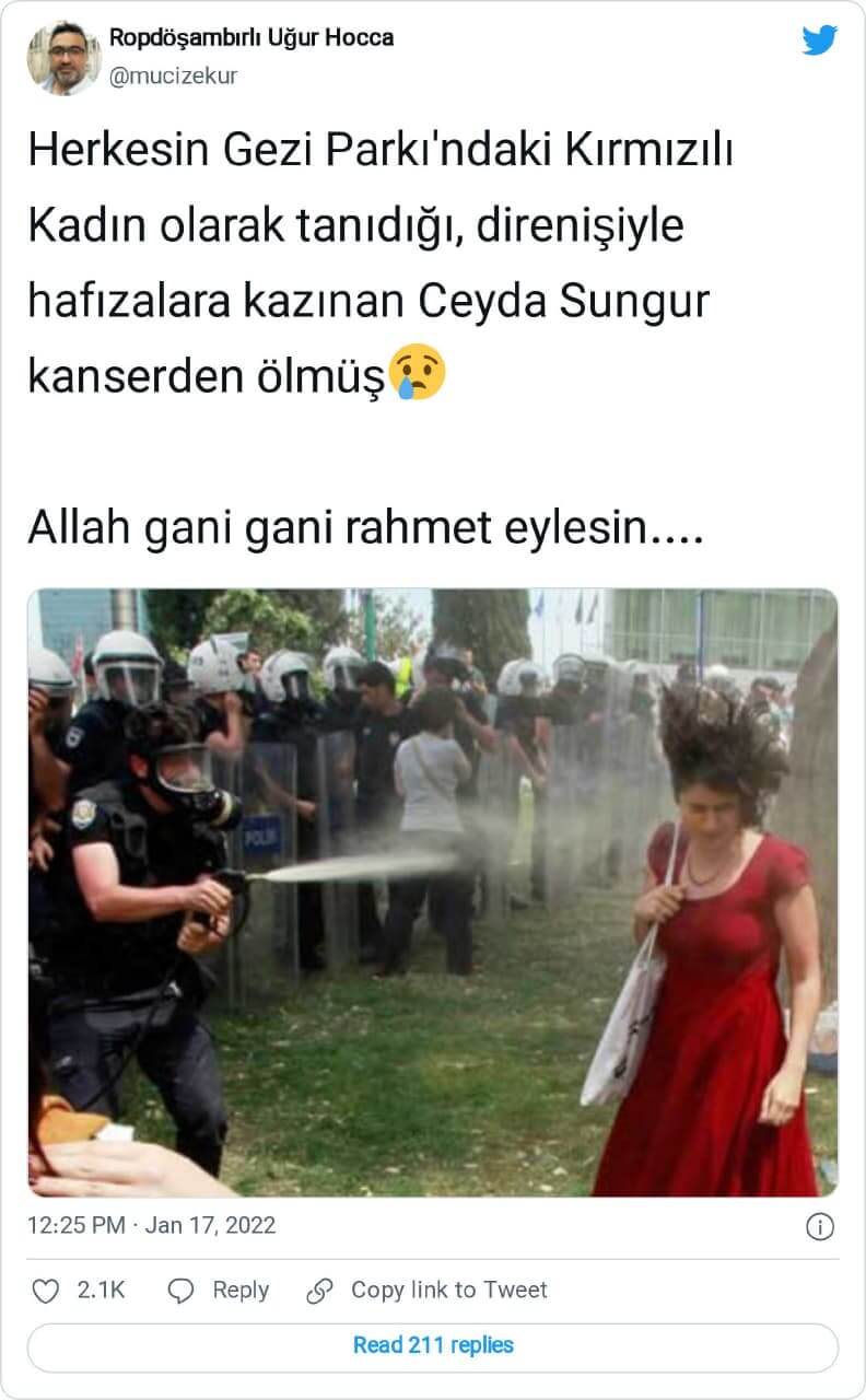 “Herkesin Gezi Parkı’ndaki Kırmızılı Kadın olarak tanıdığı, direnişiyle hafızalara kazınan Ceyda Sungur kanserden ölmüş😢 Allah gani gani rahmet eylesin….”