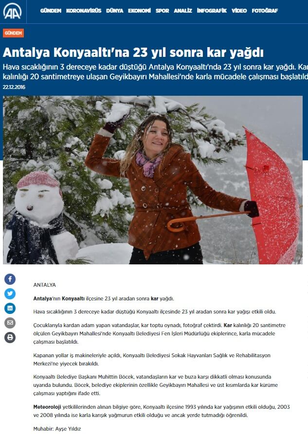 Örneğin, Antalya’ya (1993 yılı Ocak ayından bu yana) 29 yıllık aradan sonra ilk kez kar yağdığına dair haberler basına yansısa da Antalya kent merkezine 2008 ve 2016 yıllarında da kar yağmıştı.