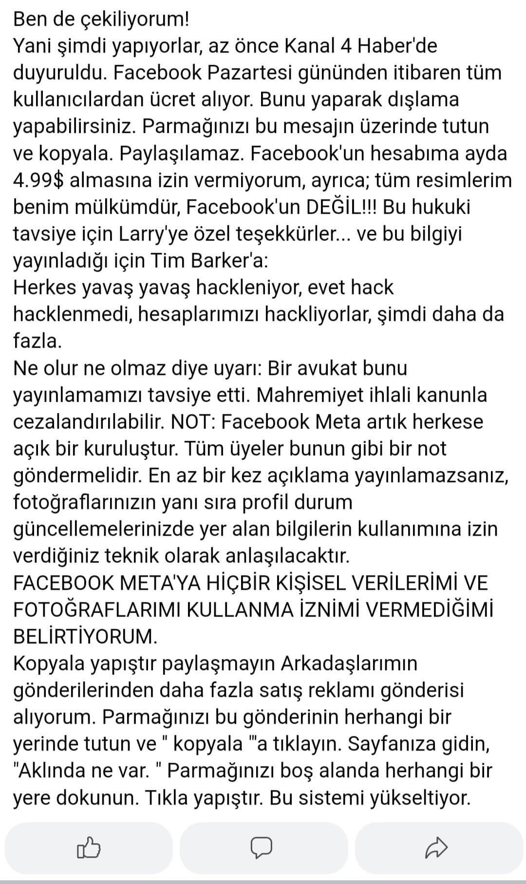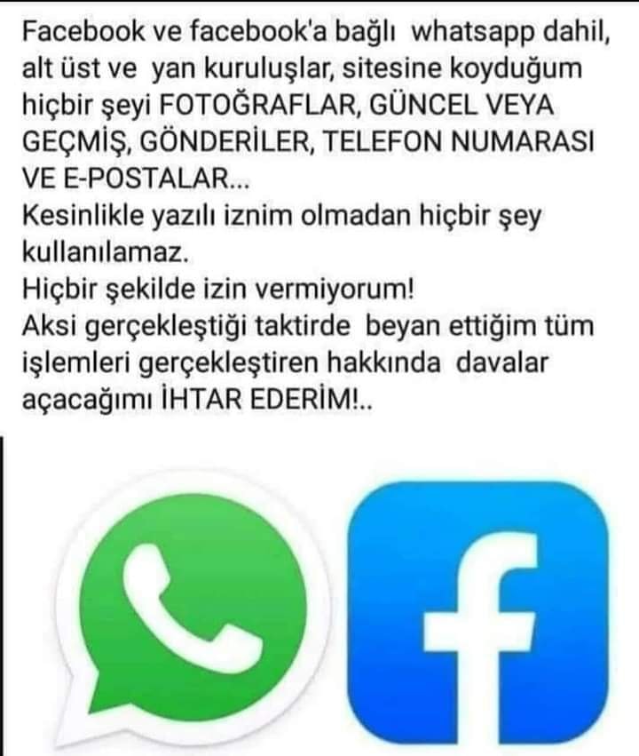 Dikkat!!️!!Unutmayın yarın yeni Facebook kuralı başlıyor, fotoğraflarınızın kullanabileceği şekilde.Son teslim tarihinin bugün olduğunu unutmayın!!! Hakkınızda açılan davalarda kullanılabilir.Paylaştığın her şey bugünden itibaren herkese açık-silinen mesajlar bile. Basit bir kopya ve post için hiçbir şeye mal olmaz, üzgün olmaktansa güvende olur.Facebook’a veya Facebook ile ilgili herhangi bir kuruluşun, geçmişten ve gelecekten fotoğraflarımı, bilgilerimi, mesajlarımı veya gönderilerimi kullanmasına izin vermiyorum.Bu açıklamayla, Facebook’a bu profil ve/veya içeriğine göre bana karşı başka bir eylemi açıklamanın, kopyalamanın, yaymanın veya yapmanın kesinlikle yasak olduğunu bildiriyorum.Bu profilin içeriği gizli ve gizli bilgilerdir. Özel hayatımın ihlalleri kanunla cezalandırılabilir.”NOT: ”Facebook” artık kamu birimi. Tüm üyeler böyle bir not atmalı. İsterseniz bu metni kopyalayıp yapıştırabilirsiniz.Açıklamayı en az bir kez yayınlamazsanız, fotoğraflarınızın ve profil durum güncellemelerinizde yer alan bilgilerin yanı sıra sessizce kullanıma izin vereceksiniz. “Paylaş değil, kopyala+yapıştır!”Sonuç olarak: Facebook’un web sitesine koyduğum hiçbir şeyi paylaşmasına izin vermiyorum. FOTOĞRAFLAR, GÜNCEL VEYA GEÇMİŞ, GÖNDERİLER, TELEFON NUMARASI VE E-POSTALAR… Kesinlikle yazılı iznim veya sözlü içeriğim olmadan hiçbir şey kullanılamaz.Hiçbir şekilde izin vermiyorum! Aksi gerçekleştiği taktirde Facebook siteminin kendisi, Facebook’a bağlı alt üst ve yan kuruluşlar, aynı zamanda izin vermediğimi beyan ettiğim tüm işlemleri gerçekleştiren ikinci ve üçüncü şahıslara karşı suç durusunda bulunacağımı, maddi manevi tazminat davaları açagımı, yapacagım her türlü masrafın ve avukat vekalet ücretinin karşı tarafa ait olacağını İHTAR EDERİM!..