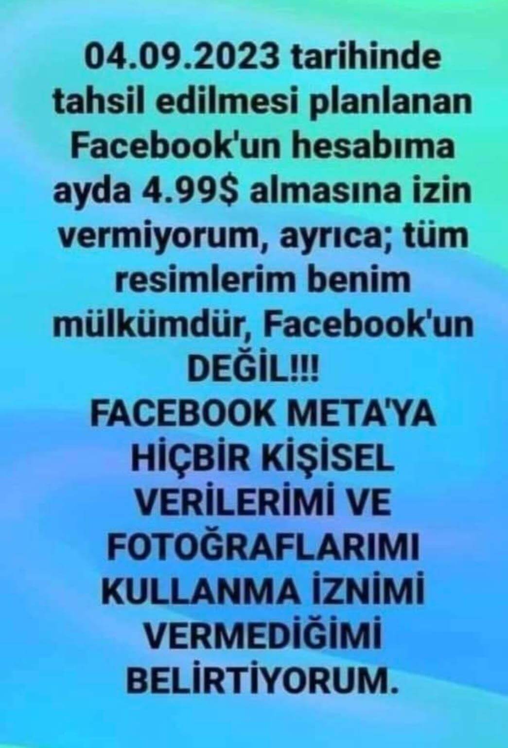 “04.09.2023 tarihinde tahsil edilmesi planlanan Facebook’un hesabıma ayda 4.99 $ almasına izin vermiyorum, ayrıca; tüm resimlerim benim mülkümdür, Facebook’un DEĞİL!!! FACEBOOK META’YA HİÇBİR KİŞİSEL VERİLERİMİ VE FOTOĞRAFLARIMI KULLANMA İZNİMİ VERMEDİĞİMİ BELİRTİYORUM.”