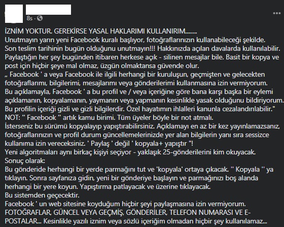 FACEBOOK’UN İZNİM OLMADAN HİÇBİR BİLGİMİ KULLANILMASINA İZİN VERMİYORUMUnutmayın yarın yeni Facebook kuralı başlıyor, fotoğraflarınızın kullanabileceği şekilde.Son teslim tarihinin bugün olduğunu unutmayın!!! Hakkınızda açılan davalarda kullanılabilir.Paylaştığın her şey bugünden itibaren herkese açık-silinen mesajlar bile. Basit bir kopya ve post için hiçbir şeye mal olmaz, üzgün olmaktansa güvende olur.Facebook’a veya Facebook ile ilgili herhangi bir kuruluşun, geçmişten ve gelecekten fotoğraflarımı, bilgilerimi, mesajlarımı veya gönderilerimi kullanmasına izin vermiyorum.Bu açıklamayla, Facebook’a bu profil ve/veya içeriğine göre bana karşı başka bir eylemi açıklamanın, kopyalamanın, yaymanın veya yapmanın kesinlikle yasak olduğunu bildiriyorum.Bu profilin içeriği gizli ve gizli bilgilerdir. Özel hayatımın ihlalleri kanunla cezalandırılabilir.”NOT: ”Facebook” artık kamu birimi. Tüm üyeler böyle bir not atmalı. İsterseniz bu metni kopyalayıp yapıştırabilirsiniz.Açıklamayı en az bir kez yayınlamazsanız, fotoğraflarınızın ve profil durum güncellemelerinizde yer alan bilgilerin yanı sıra sessizce kullanıma izin vereceksiniz. “Paylaş değil, kopyala+yapıştır!”Sonuç olarak: Facebook’un web sitesine koyduğum hiçbir şeyi paylaşmasına izin vermiyorum.FOTOĞRAFLAR, GÜNCEL VEYA GEÇMİŞ, GÖNDERİLER, TELEFON NUMARASI VE E-POSTALAR… Kesinlikle yazılı iznim veya sözlü içeriğim olmadan hiçbir şey kullanılamaz.Hiçbir şekilde izin vermiyorum!