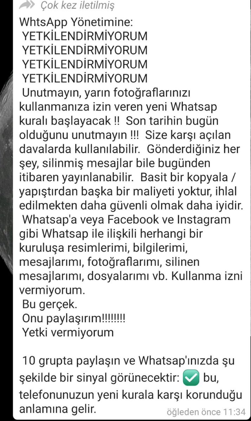 Unutmayın, yarın fotoğraflarınızı kullanmanıza izin veren yeni Whatsap kuralı başlayacak!! Son tarihin bugün olduğunu unutmayın!!! Size karşı açılan davalarda kullanılabilir. Gönderdiğiniz her şey, silinmiş mesajlar bile bugünden itibaren yayınlanabilir. Basit bir kopyala / yapıştırdan başka bir maliyeti yoktur, ihlal edilmekten daha güvenli olmak daha iyidir. Whatsap’a veya Facebook ve Instagram gibi Whatsap ile ilişkili herhangi bir kuruluşa resimlerimi, bilgilerimi, mesajlarımı, fotoğraflarıı, silinen mesajlarımı, dosyalarımı vb. Kullanma izni vermiyorum.