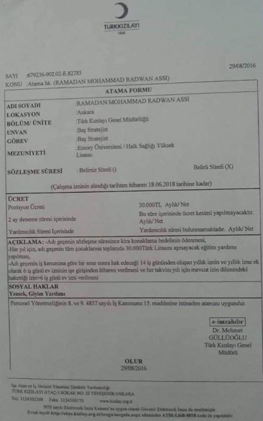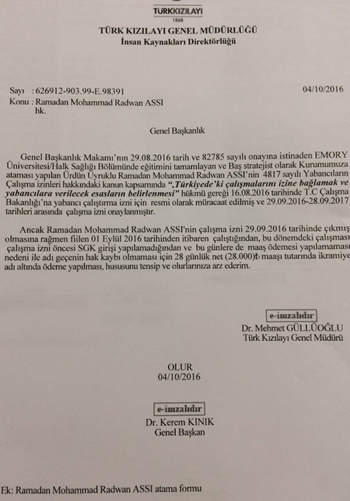 Ramadan Mohammed Radwan Assi’nin Kızılay’a işe başlama sürecinde Türk Kızılayı Genel Müdürlüğü İnsan Kaynakları Direktörlüğü’ne 04/10/2016 tarihinde gönderilen atama ile ilgili gönderilen ve altında Kızılay Genel Başkanı Dr. Kerem Kınık’ın e-imzası bulunan 626912-903.99-E.98391 sayılı olurda “… Ürdün asıllı Ramadan Mohammad Radwan Assı’nın 4817 sayılı Yabancıların Çalışma izinleri hakkında kanun kapsamında ‘Türkiye’deki çalışmalarını izine bağlamak ve yabancılara verilecek esasların belirlenmesi’ hükmü gereği 16.08.2016 tarihinde T.C Çalışma ve Sosyal Güvenlik Bakanlığı’na yabancı çalıştırma izni için resmi olarak müracaat edilmiş ve 29.09.2016-28.09.2017 tarihleri arasında çalışma izni onaylanmıştır ” ifadesi yer almaktaydı.