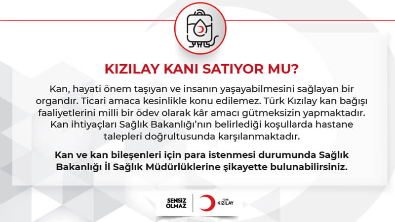 Kızılay, kanunla verilen yetkiye ve Sağlık Bakanlığı tarafından belirlenen kurallara uygun olarak bağışçıdan aldığı kanı laboratuvar güvenlik testlerinden geçirip üç farklı kan bileşenine ayırır ve talep yapan tüm hastanelere, özel donanımlı araçlarla uygun koşullarda ulaştırır. Bu süreçlerin herhangi bir aşamasında vatandaşlardan “kan parası” adı altında ya da başka başlık altında HİÇBİR ÜCRET TALEP EDİLMEMEKTEDİR.